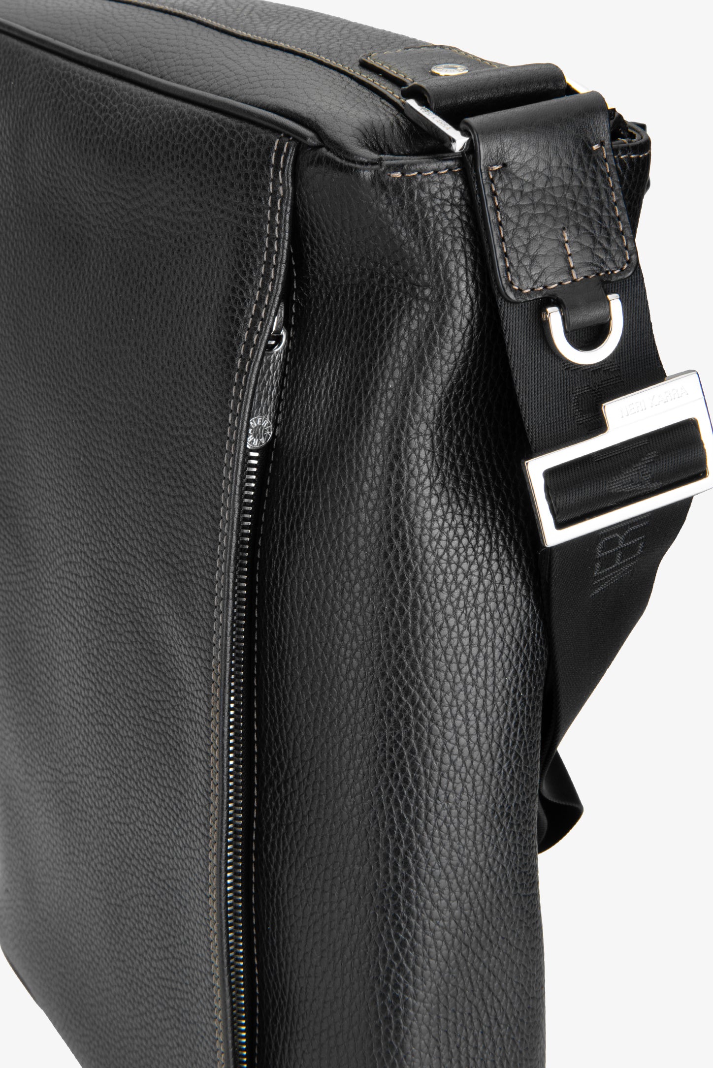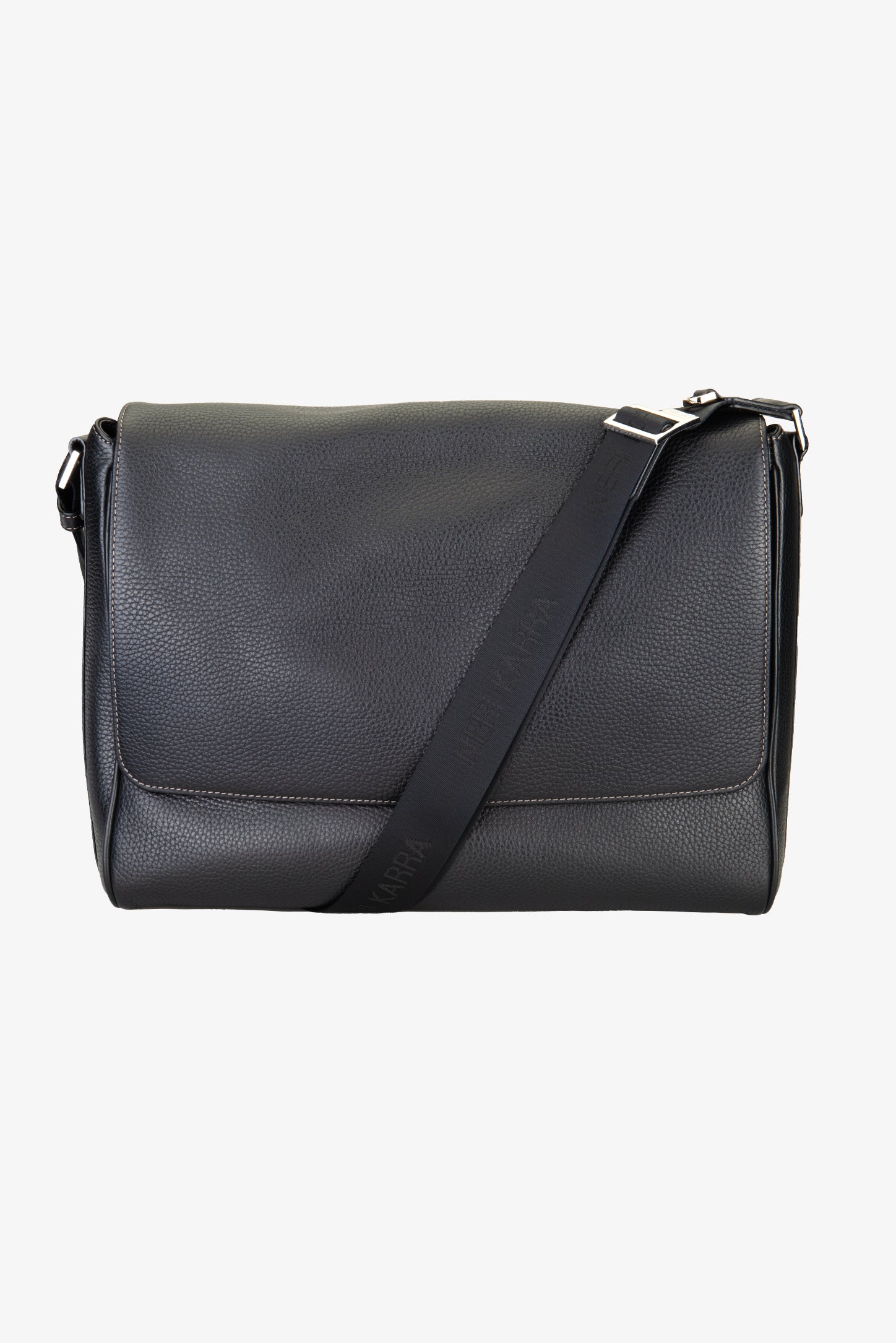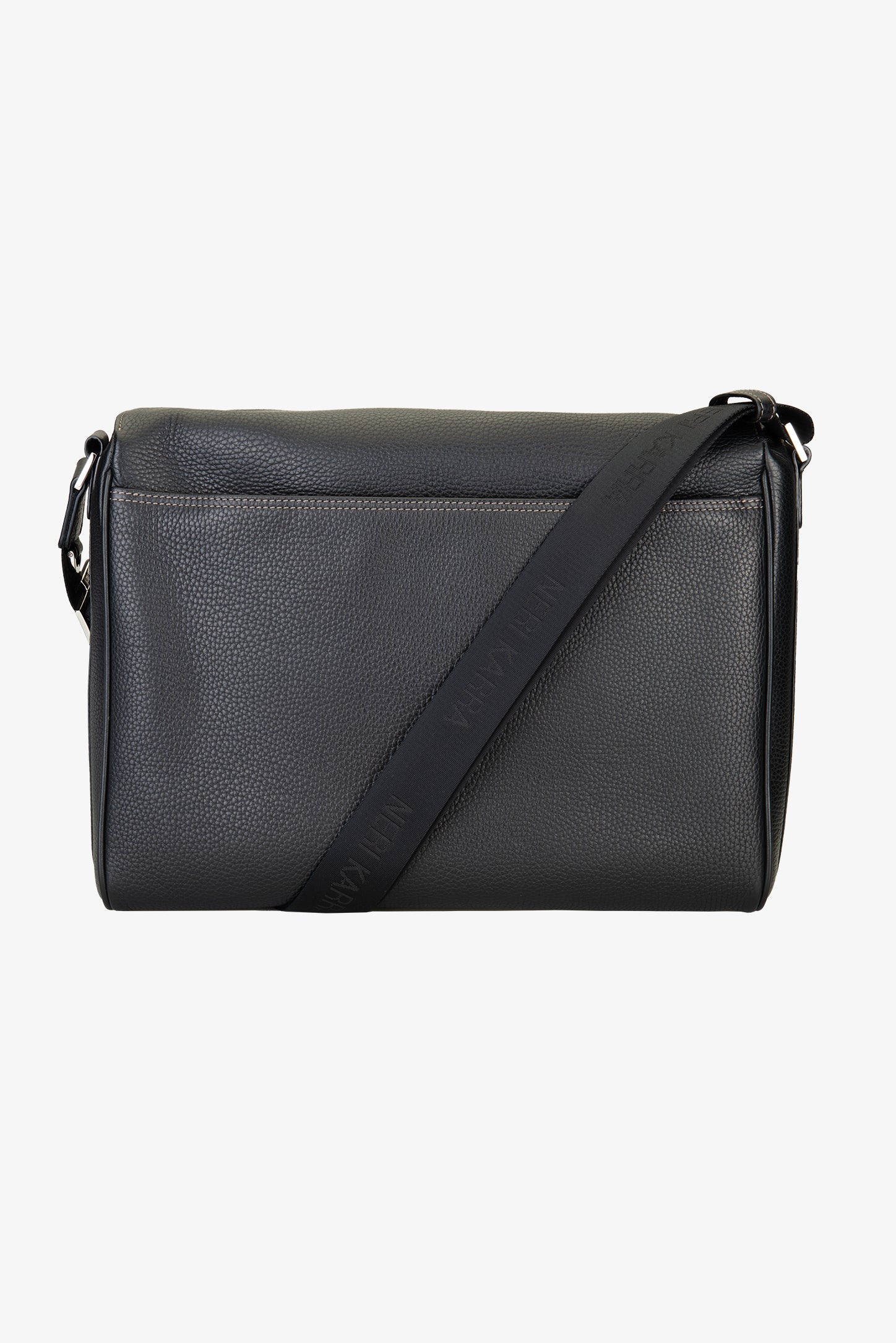 Organize all your casual and business essentials in style with the Jimmy men’s messenger bag. Featuring luxurious leather craftsmanship in black pebbled leather and fine hardware detailing, this bag details a spacious main compartment to fit your laptop and documents easily, with interior pockets for small essentials and valuables. An adjustable shoulder strap with the brand’s signature in debossed lettering finishes the look in standout style.
